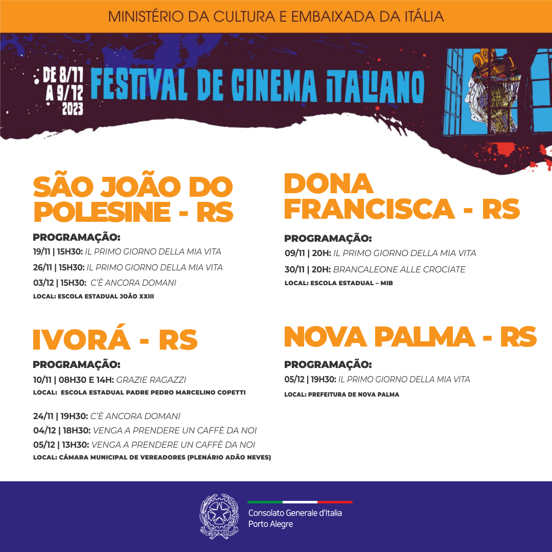 O Consulado-Geral da Itália em Porto Alegre tem o prazer de convidar todos para prestigiar o Festival de Cinema Italiano no Rio Grande do Sul. A programação ocorre de 08 de novembro a 09 de dezembro de 2023, com sessões em mais de 15 municípios gaúchos, todas elas gratuitas.